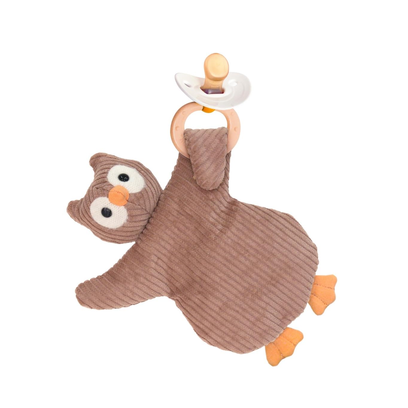 Pacifier holder, owl puppet and owl plush.
